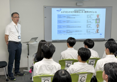 7月29日、情報科2年生は「レジリエントICT研修」の一環としてNICT(情報通信研究機構)レジリエントICT研究センターを訪問し、研究センター長の井上真杉氏をはじめとする研究者の方々から、研……