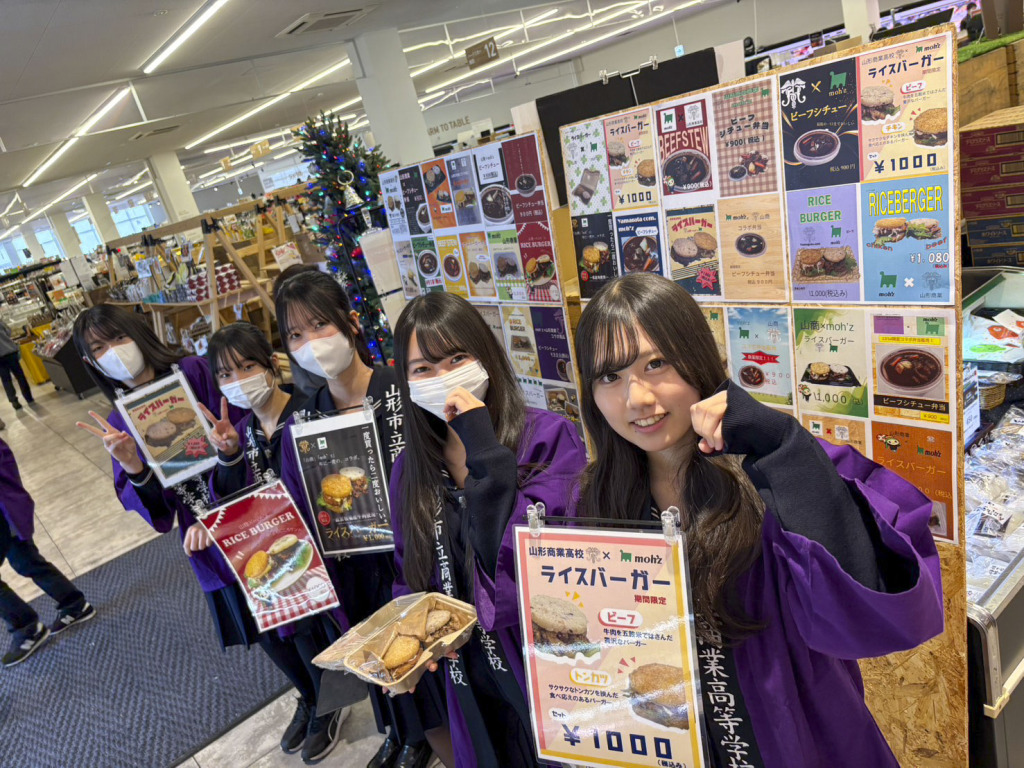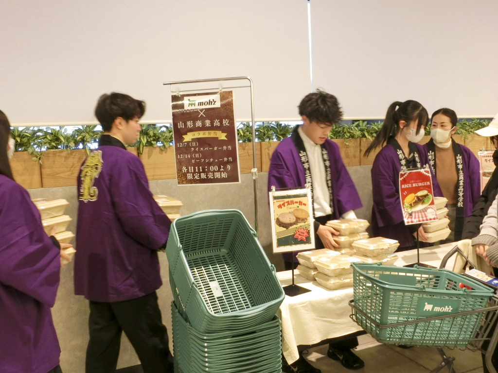 学科 お知らせ 【総ビ・情報・経済/選択科目】山商&moh’zコラボ弁当発売(商品開発と流通) 2025.12.08 3年選択科目 「商品開発と流通」の授業で、山形市内でスーパーマーケット等を経営している髙橋畜産食肉株式会社さん(moh’z)と共同企画したコラボ弁当が数量限定で発売されました。 共同企画開発し、商品化したお弁当は2種類!「ライスバーガー」と「ビーフシチュー」です。 第一弾として、12月7日(日)は、「ライスバーガー」の販売でした。販売実習として店頭に立ち、声をかけること、販売することの難しさも学びました。moh’zさん、貴重な経験をさせていただきありがとうございました。 第二弾は、「ビーフシチュー」の販売、12月14日(日)11:00~販売開始です!是非ご来店くだ