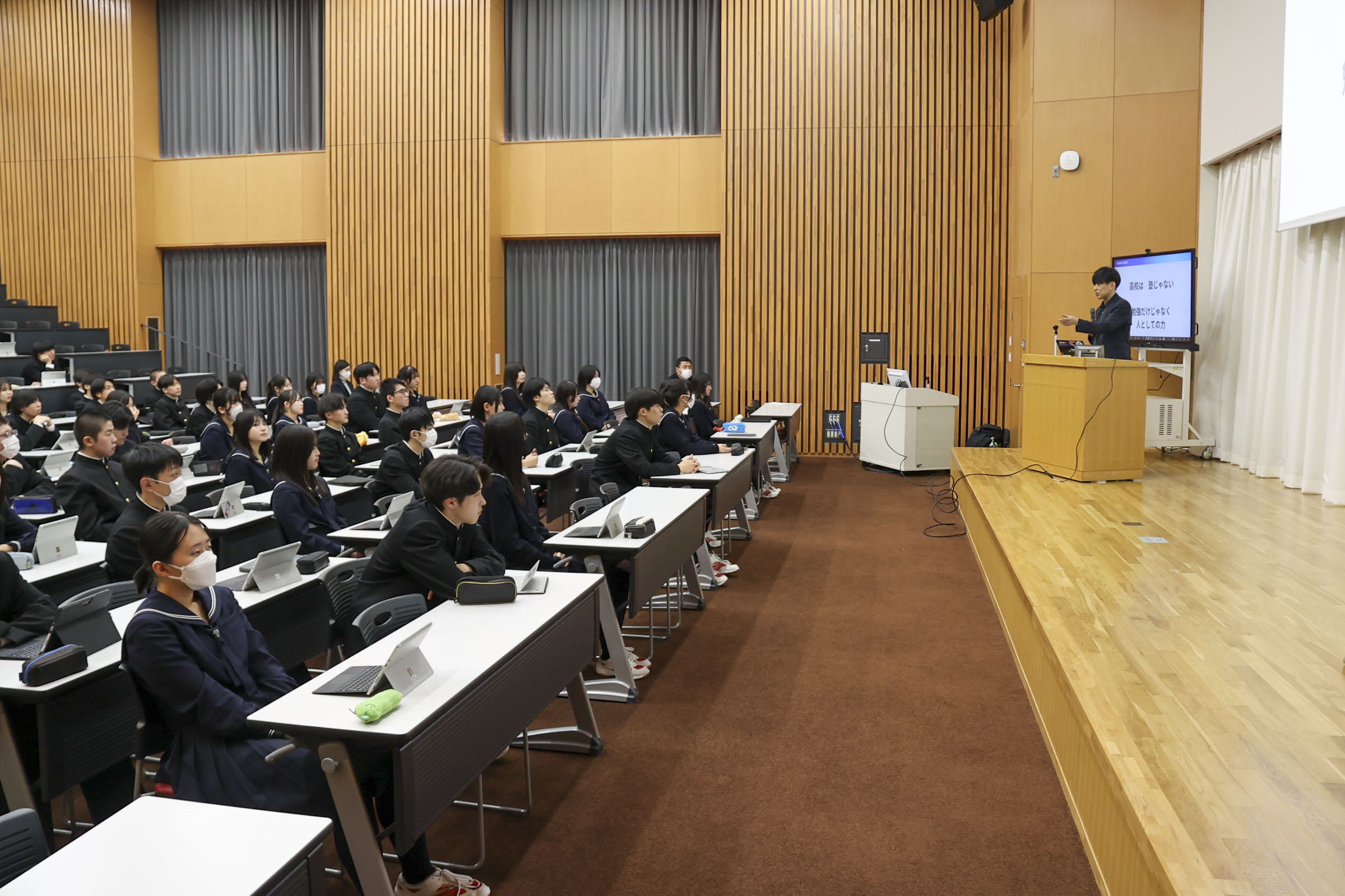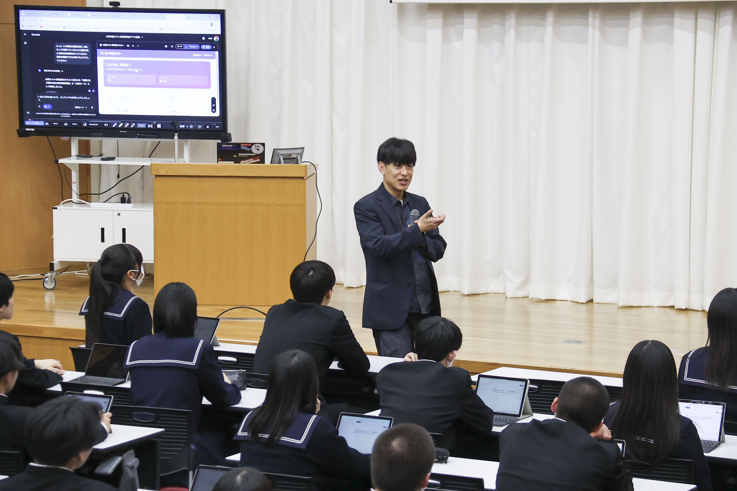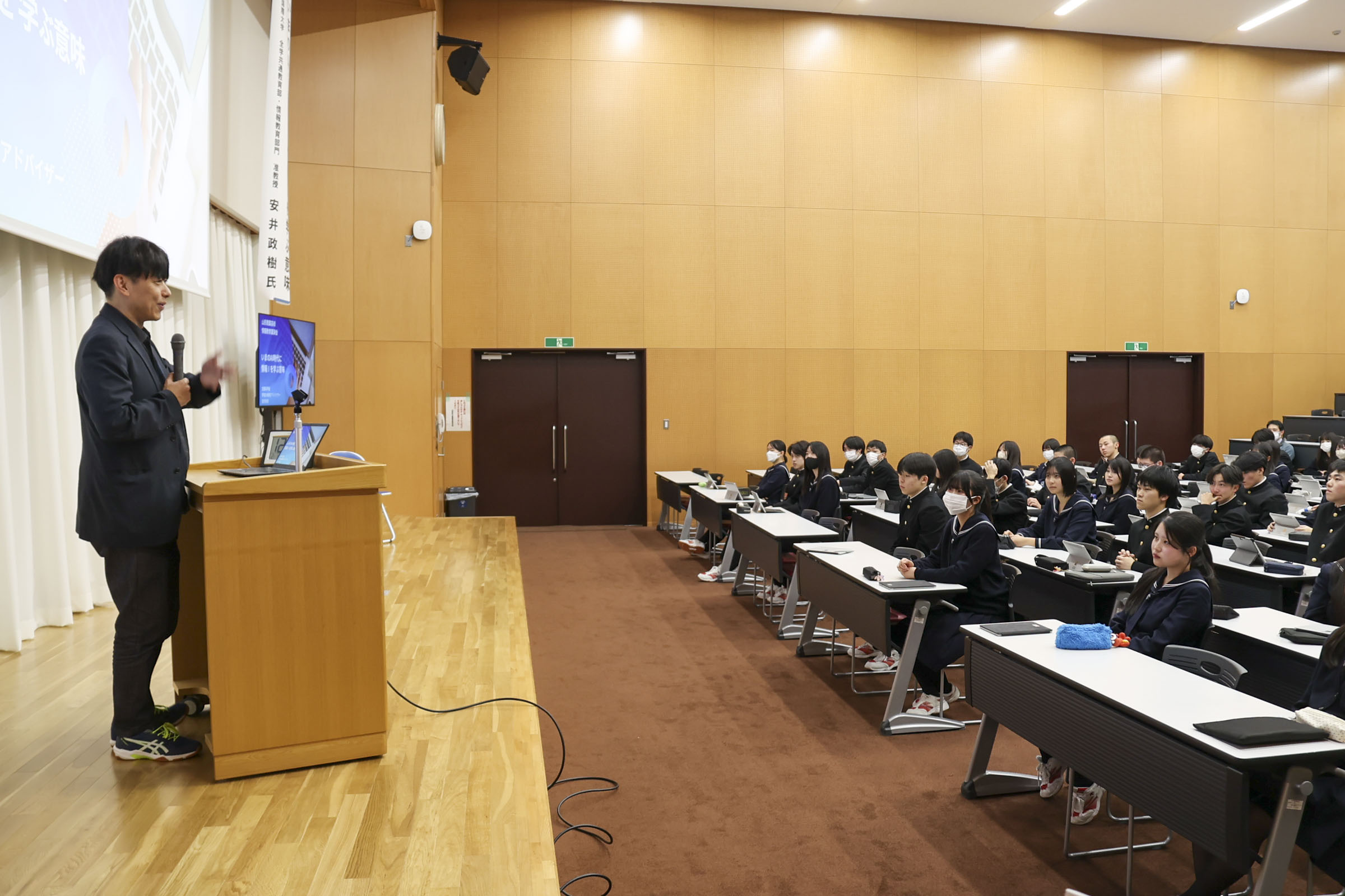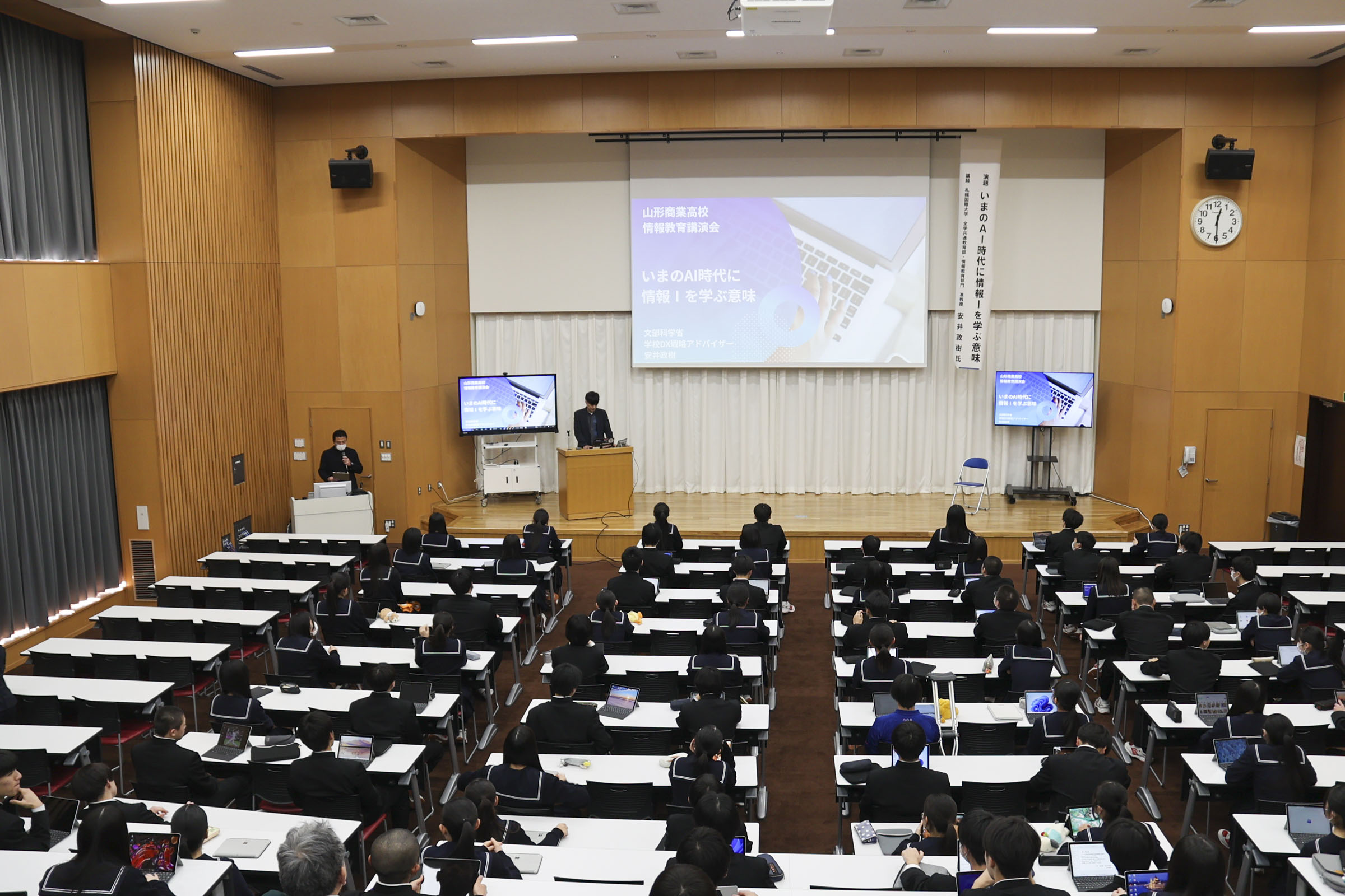学科 お知らせ 【経済科 DXハイスクール】いまのAI時代に情報Ⅰを学ぶ意味 札幌国際大学 安井政樹准教授 2026.02.04 本校経済科1年生を対象に、札幌国際大学准教授 安井先生による「AI時代に情報を学ぶ意味」と題した講演会が行われました。 先生は「商業の子は大学に来ても強い。パソコンができることは自分自身の基礎であり武器になる」と熱く語られました。 講演では、AIを使い1秒でスライドを作成したり、苦手科目の勉強アプリを瞬時に開発したりする実演があり、「ITの力を持っているか持っていないかで人生は大きく変わる。道具を使いこなせるかどうかが大切だ」と説かれました。 また、スキルだけでなく「高校は塾じゃないから、人としての力を身につけていくことが大事」と、コミュニケーションの重要性も強調されました。 生徒たちは自分のタブレットを使い、AIを「味方」にする体験として「苦手分野の学習アプリ作成」通じて情報の学びを深めました。 最後の謝辞では「テスト勉強などに有利に活用していきたい」と、新たな武器を手にした決意が語られました。