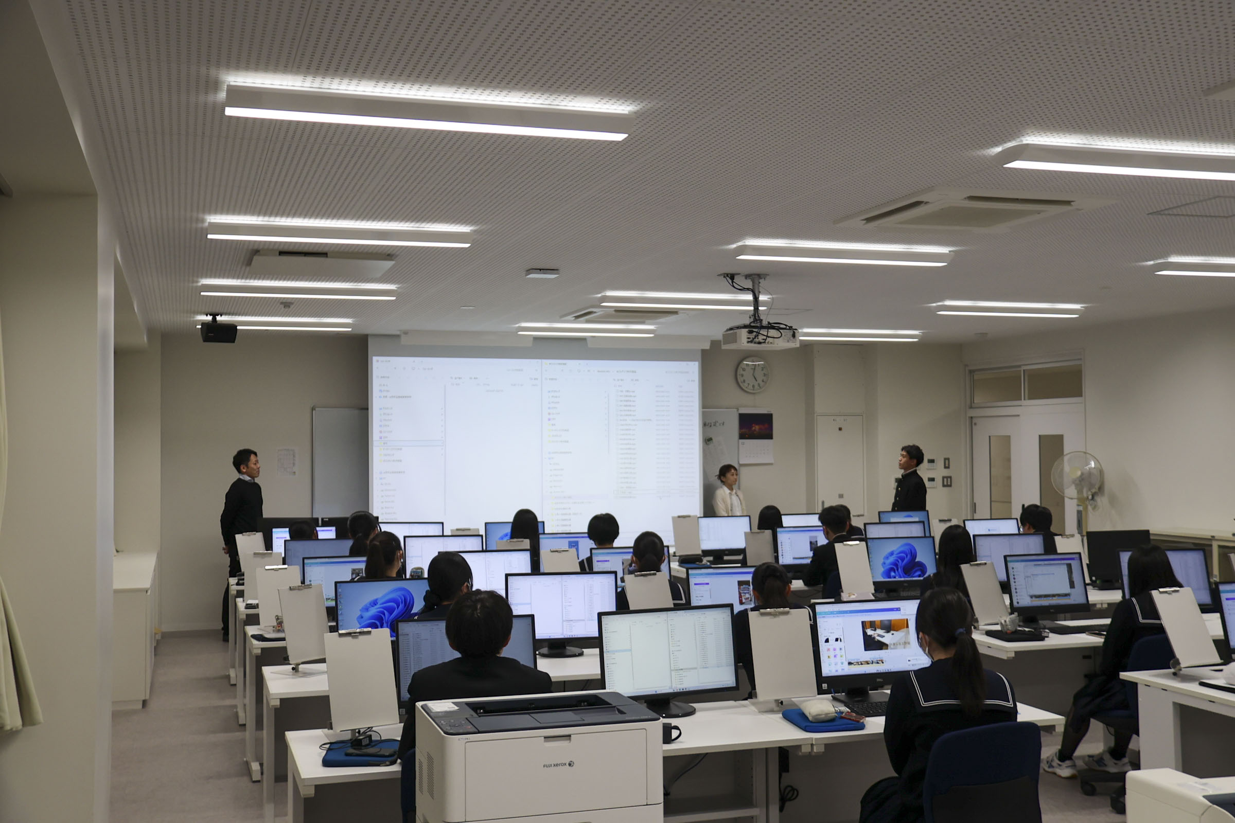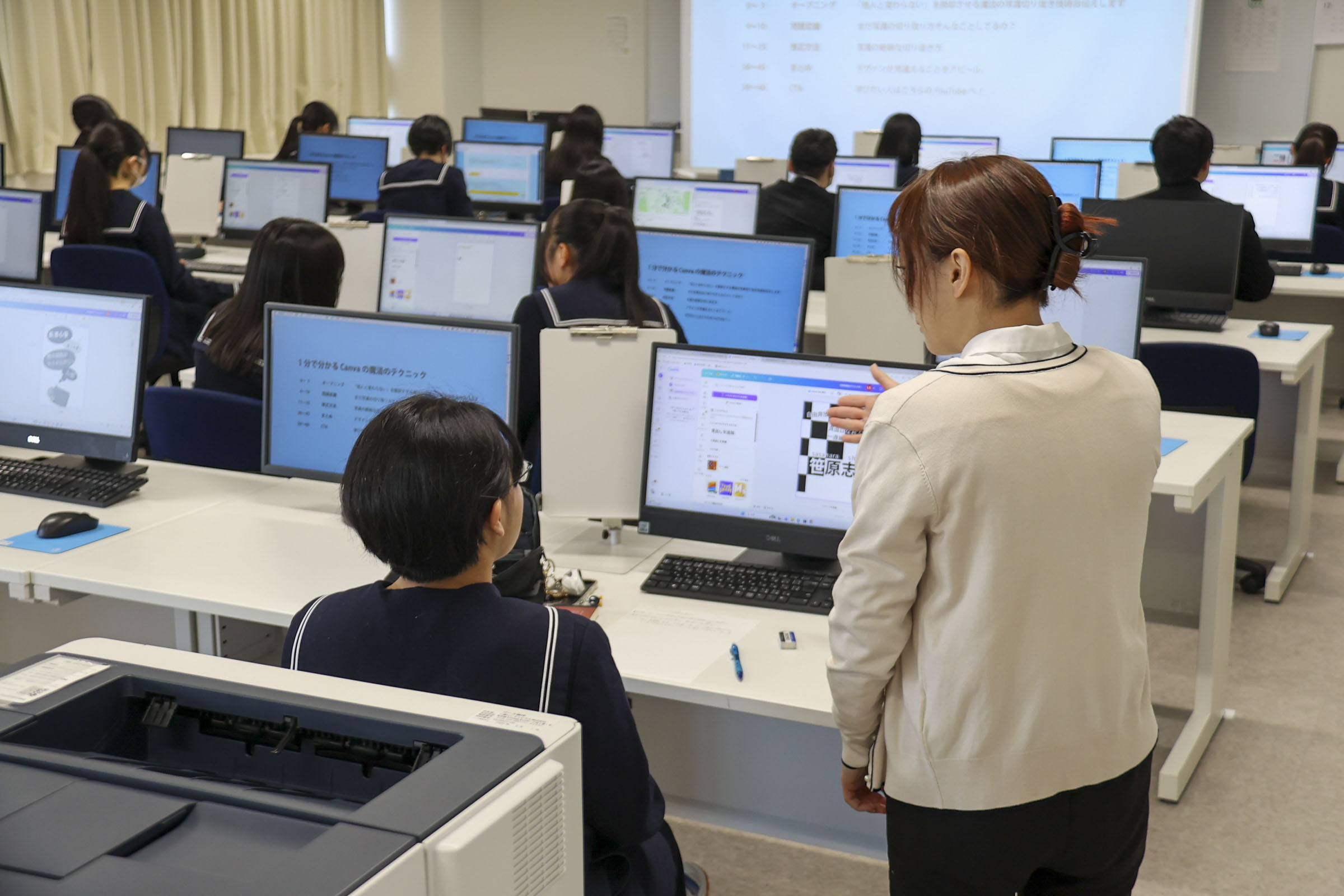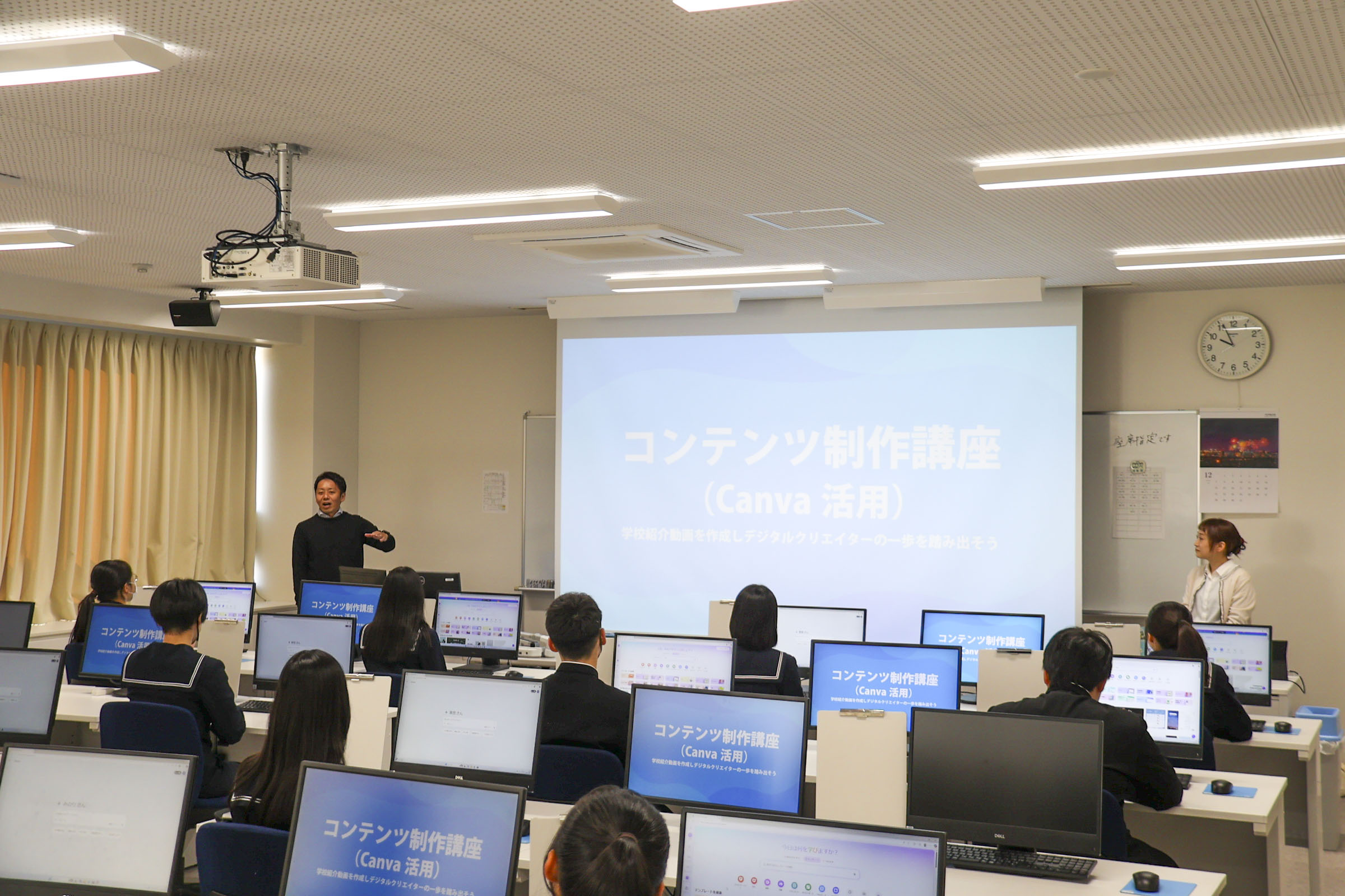 お知らせ 【DXハイスクール】コンテンツ制作講座(デジタルハリウッド大学 岡田氏/KOMABA氏) 2025.12.08 12月7日(日)DXハイスクール事業の一環として、デジタルハリウッド大学より岡田庸平氏(株式会社ルンゴ 代表取締役)・KOMABA SHIORI氏(Web Designer/coder/video editor)をお招きしコンテンツ制作講座を実施しました。今回の講座ではCanvaを用いた動画制作やSNS発信の基礎について学びました。受講した生徒からは、動画制作の奥深さやデザインの考え方など、多くの学びと気づきが寄せられました。 生徒たちは、ショート動画1本でも企画から編集まで多くの時間がかかることを実感し、伝えたい内容を短くまとめる難しさや、キャッチコピーの重要性を改めて学びました。また、Canvaの使いやすさに驚き、動画だけでなくチラシ制作など幅広い活用をしてみたいという声も上がりました。 SNSを日常的に活用している生徒からは、「投稿戦略や構成を学ぶ機会は初めてだった」「バズるための工夫を知れて役に立った」といった感想が寄せられ、今後の活動での広報に生かしたいという意欲が多く見られました。 さらに、「自分の想像を形にする難しさを知った」「企画段階で軸を持つことが大切だと気づいた」など、制作のプロセスを体験したからこその学びも多く挙がりました。初めて動画制作に取り組んだ生徒からは「新しい分野に触れる良い機会だった」「AIは創作を助ける力になると実感した」という声もあり、デジタル表現への興味が広がったようです。 今回の講座を通して、生徒たちは動画制作やデザインの楽しさだけでなく、発信する側としての視点や企画の重要性を学びました。学んだ内容を今後の学校生活や部活動、進路選択に生かしてくれることを期待しています。