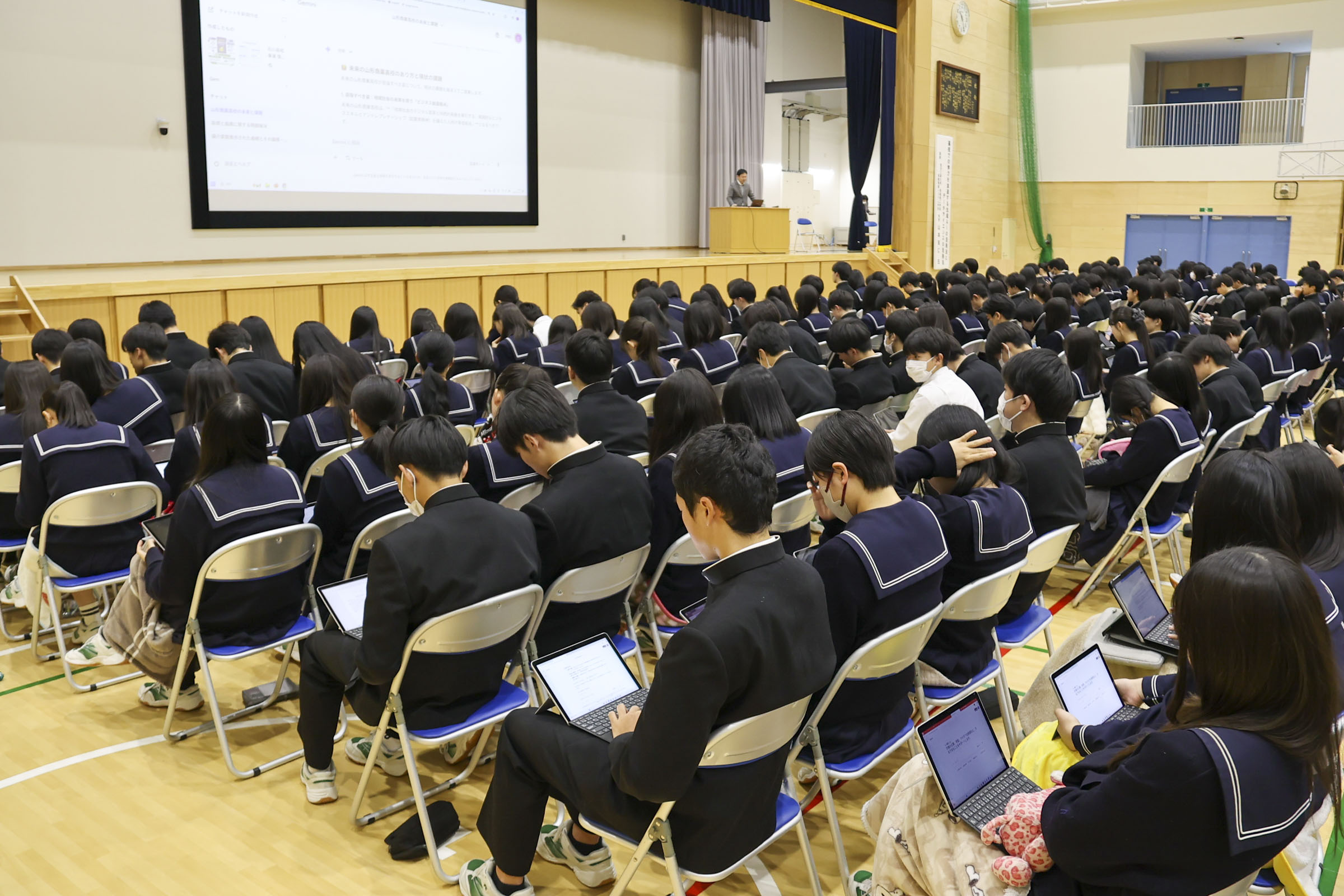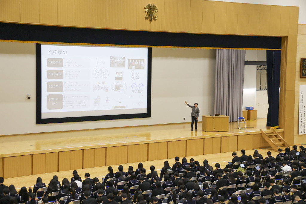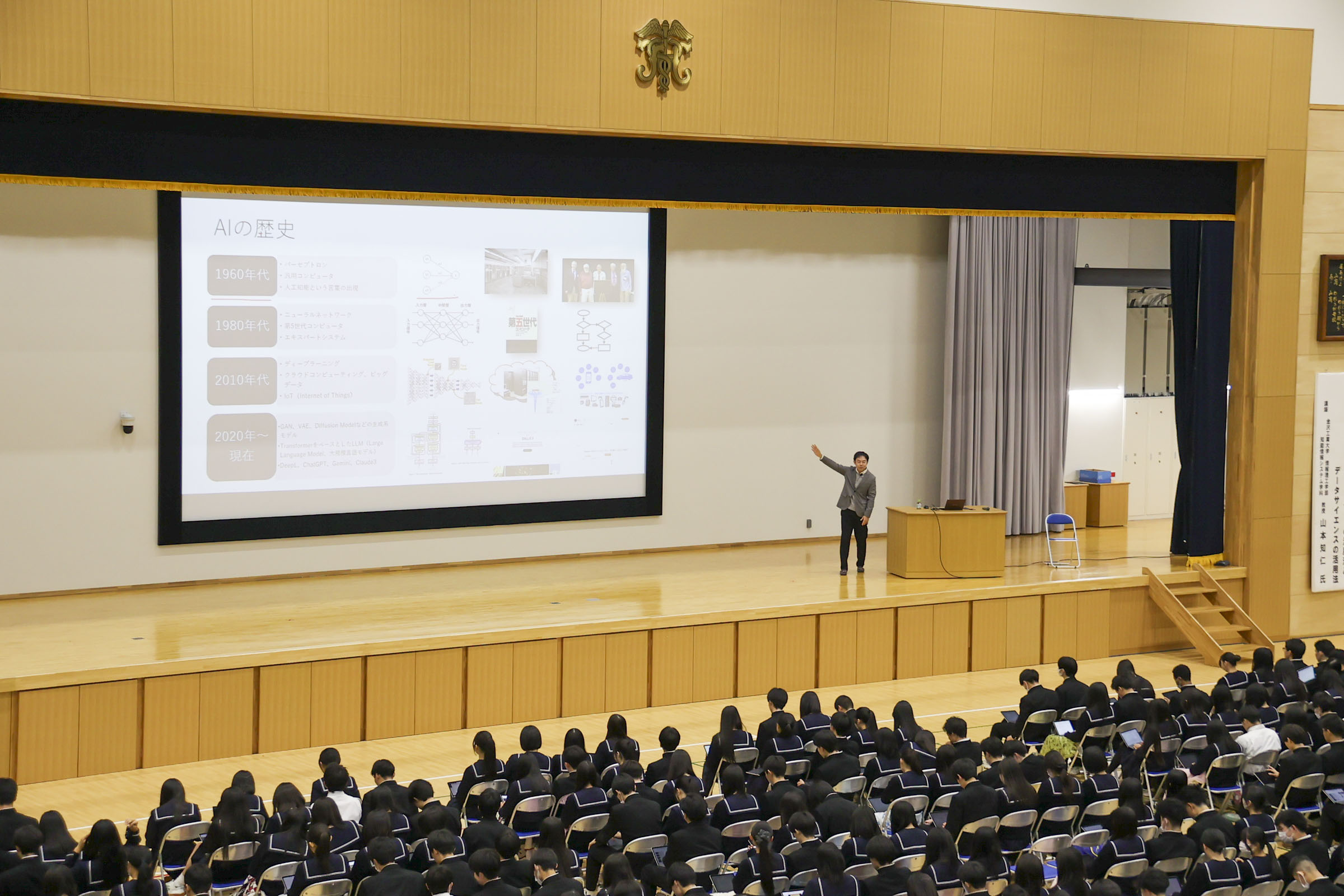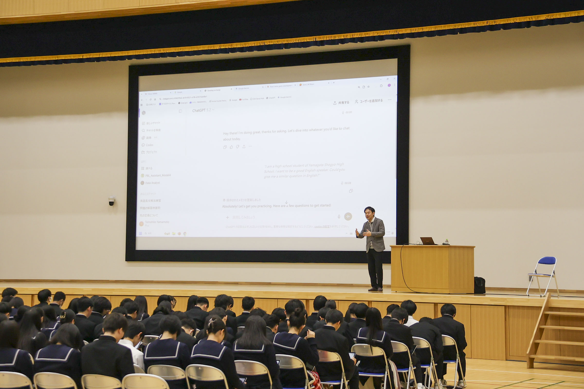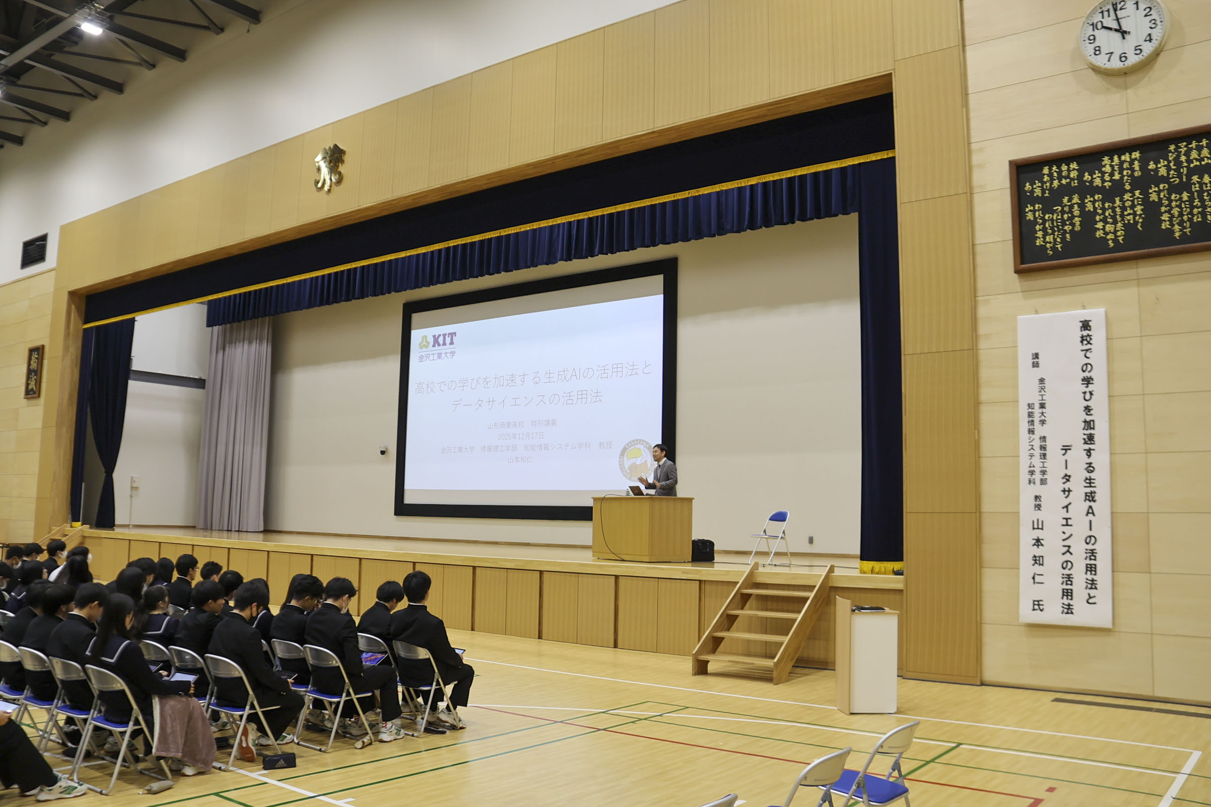 お知らせ 【DXハイスクール】 情報教育講演会(金沢工業大学 山本知仁教授) 2025.12.17 金沢工業大学の山本知仁教授による「高校での学びを加速する生成AIの活用法とデータサイエンスの活用法」と題した情報教育講演会が12月17日に開催されました。ヒューマン・コンピューター・インタラクション(HCI)を専門とする山本教授は、生成AIの驚異的な性能(東京大学の入試問題を短時間でほぼ正解に導くなど)を紹介し、生徒はタブレットで生成AI(Gemini)を操作し、学習を劇的に加速させるAIの活用法を体験しました。 AIは資格試験の類題作成や英会話・面接練習など、高校生の効率的な学びを支援すると共に、望む結果を得るための「プロンプトエンジニアリング」(効果的な質問の工夫)が重要になると解説されました。また、AIが苦手とする「答えがない問題」に取り組む探求学習の重要性や、商業分野、強豪校であるスポーツ分野におけるデータサイエンス(得点効率分析など)の活用についても触れられました。一方で、**個人情報漏洩やハルシネーション(嘘)**に注意し、AIに依存しない主体的利用が求められると強調されました。 講演後、生徒を代表して佐藤うららさんが謝辞を述べました。 「私は山本先生のこの度のお話を聞いて、人間がAIに勝つということは年々難しくなっていくと思い、AIと競争してしまうと、どんどん人間は苦しくなってしまうと考えました。そのため、勝ち負けではなくAIと並走していって、より良い関係を築くべきであると思いました。そして、今回の講演会を受け、私はAIの普及に伴い、これから人間が失っていく力は、画面越しなどではない、人同士が同じ空間の中にいる中での対面のコミュニケーション能力であると思いました。この対面のコミュニケーションは、現在のAIにはどうしてもできず、人間にしかできないことであると思ったので、時にはAIから距離を置き、AIが原因で自分にデメリットがないようにAIと関わっていきたいと思いました。AIにしかなくて人にはないものと、人にはあってAIにはないものがあると思います。これからAIがすぐ隣にいる今の時代に、人間にしかできないことを考えていこうと思いました。この度は本当にありがとうございました。」