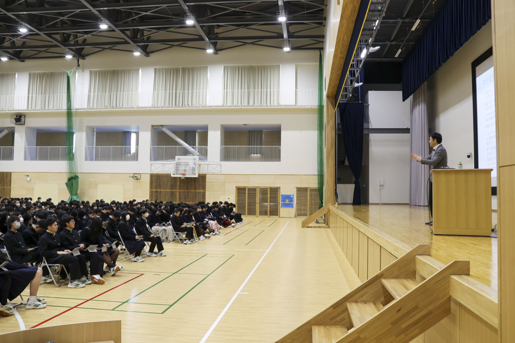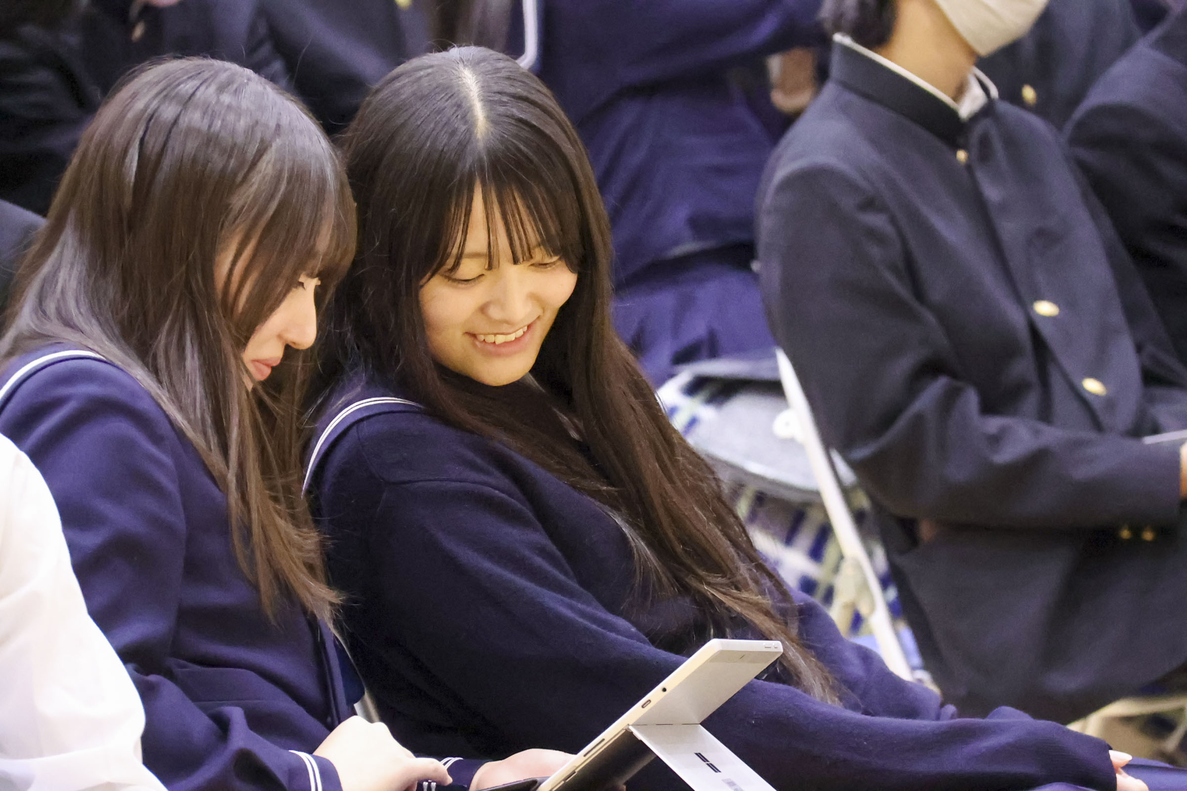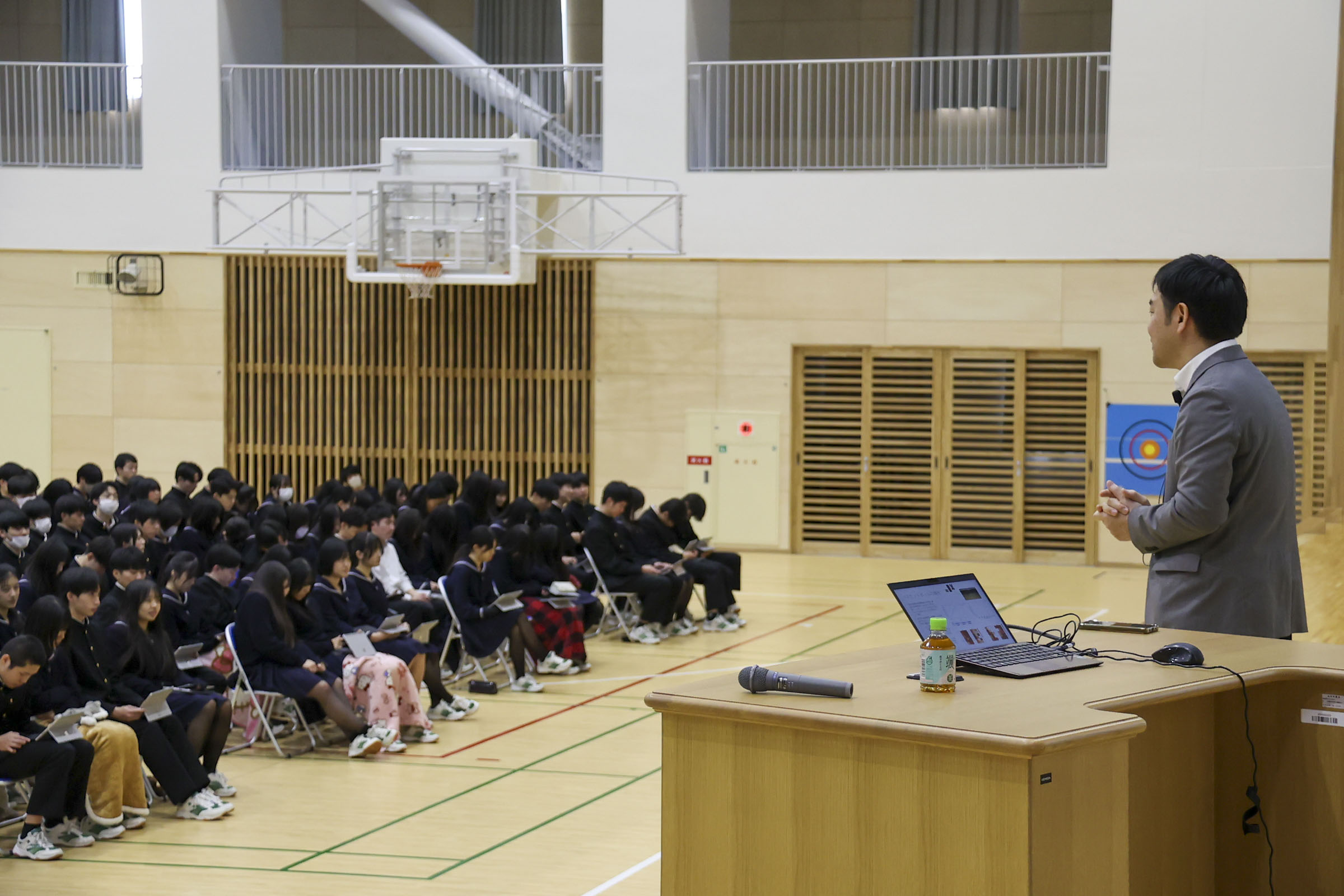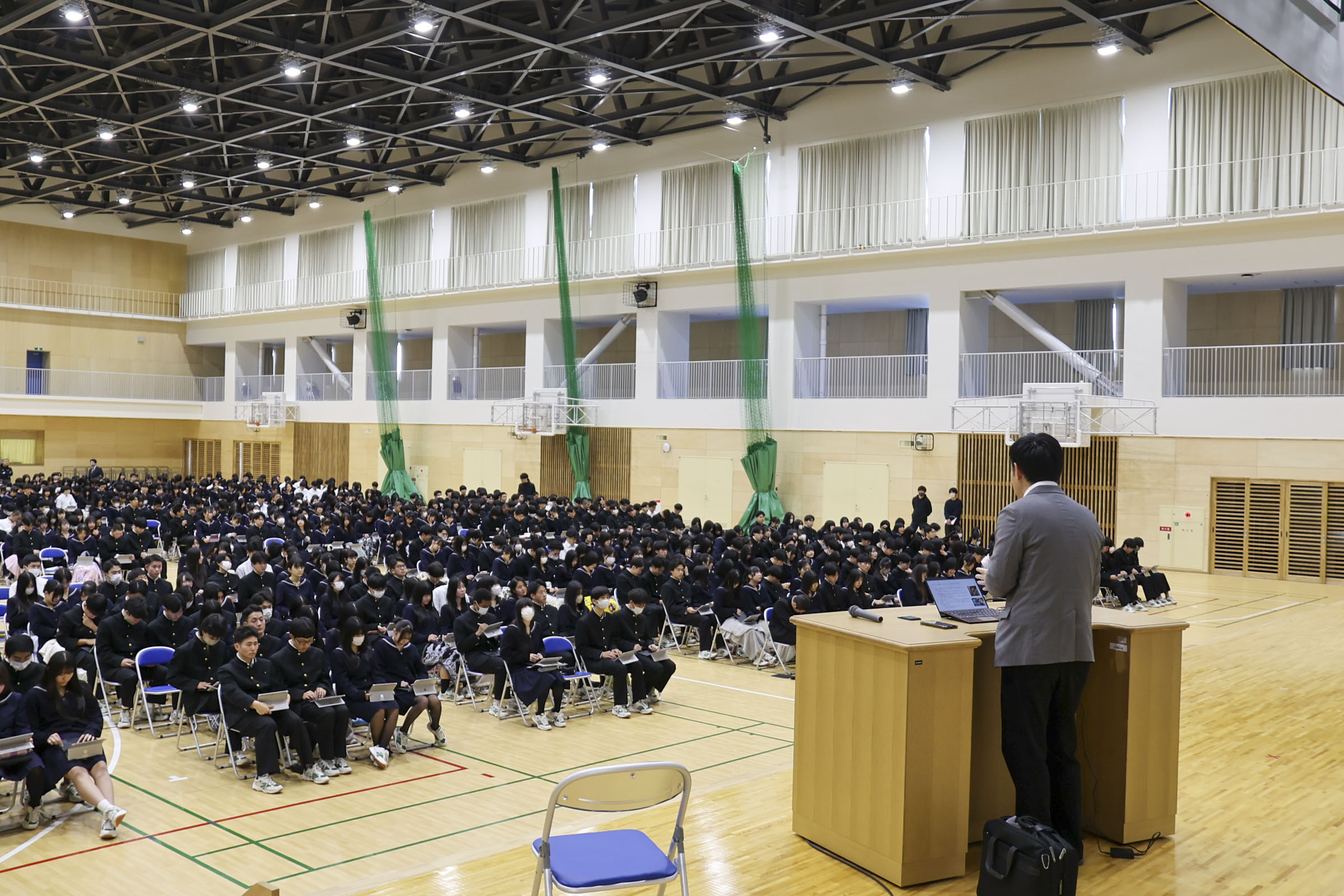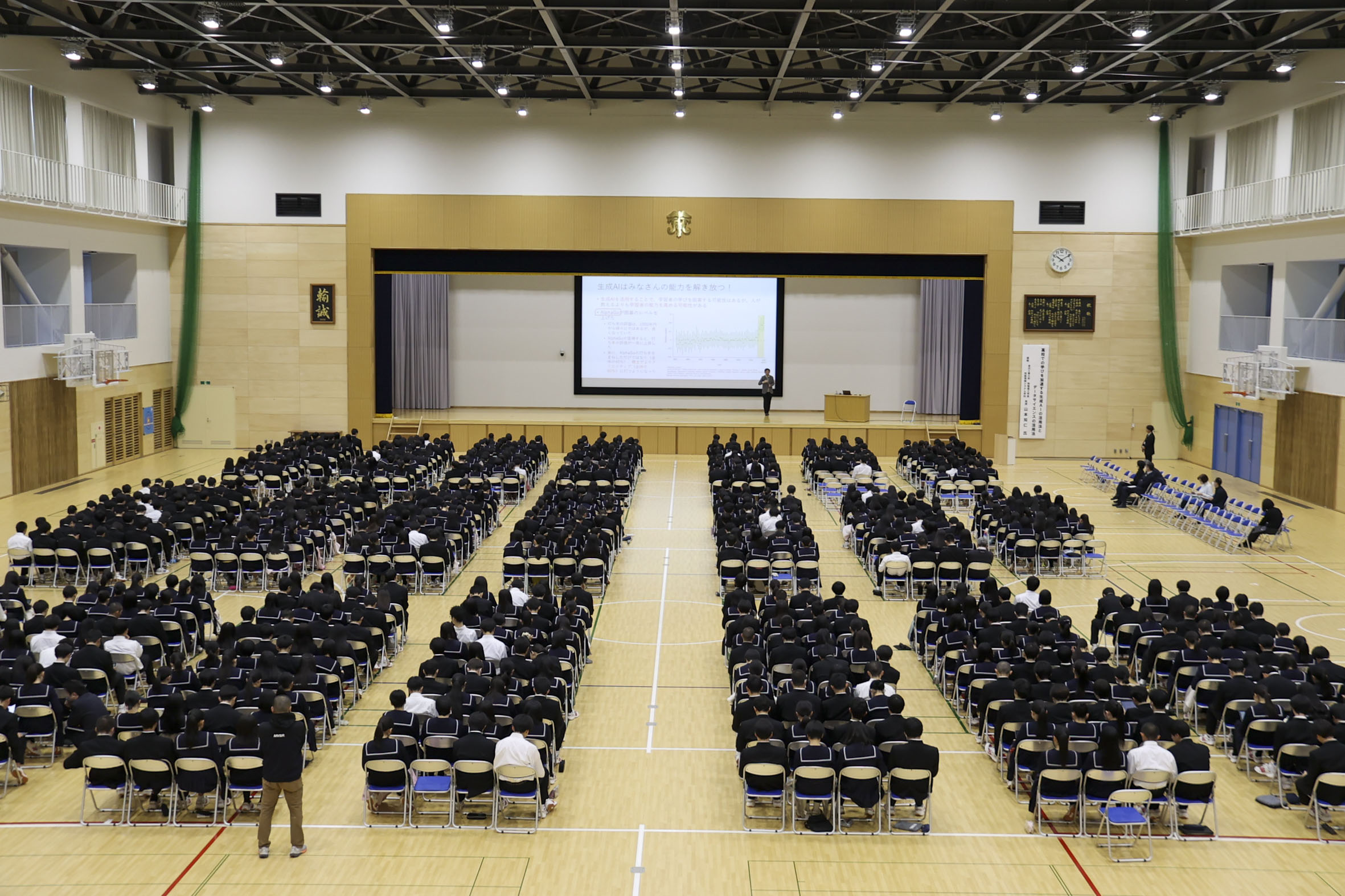 お知らせ 【DXハイスクール】 情報教育講演会(金沢工業大学 山本知仁教授) 2025.12.17 金沢工業大学の山本知仁教授による「高校での学びを加速する生成AIの活用法とデータサイエンスの活用法」と題した情報教育講演会が12月17日に開催されました。ヒューマン・コンピューター・インタラクション(HCI)を専門とする山本教授は、生成AIの驚異的な性能(東京大学の入試問題を短時間でほぼ正解に導くなど)を紹介し、生徒はタブレットで生成AI(Gemini)を操作し、学習を劇的に加速させるAIの活用法を体験しました。 AIは資格試験の類題作成や英会話・面接練習など、高校生の効率的な学びを支援すると共に、望む結果を得るための「プロンプトエンジニアリング」(効果的な質問の工夫)が重要になると解説されました。また、AIが苦手とする「答えがない問題」に取り組む探求学習の重要性や、商業分野、強豪校であるスポーツ分野におけるデータサイエンス(得点効率分析など)の活用についても触れられました。一方で、**個人情報漏洩やハルシネーション(嘘)**に注意し、AIに依存しない主体的利用が求められると強調されました。 講演後、生徒を代表して佐藤うららさんが謝辞を述べました。 「私は山本先生のこの度のお話を聞いて、人間がAIに勝つということは年々難しくなっていくと思い、AIと競争してしまうと、どんどん人間は苦しくなってしまうと考えました。そのため、勝ち負けではなくAIと並走していって、より良い関係を築くべきであると思いました。そして、今回の講演会を受け、私はAIの普及に伴い、これから人間が失っていく力は、画面越しなどではない、人同士が同じ空間の中にいる中での対面のコミュニケーション能力であると思いました。この対面のコミュニケーションは、現在のAIにはどうしてもできず、人間にしかできないことであると思ったので、時にはAIから距離を置き、AIが原因で自分にデメリットがないようにAIと関わっていきたいと思いました。AIにしかなくて人にはないものと、人にはあってAIにはないものがあると思います。これからAIがすぐ隣にいる今の時代に、人間にしかできないことを考えていこうと思いました。この度は本当にありがとうございました。」
