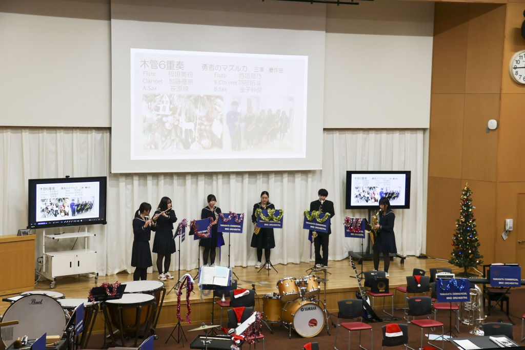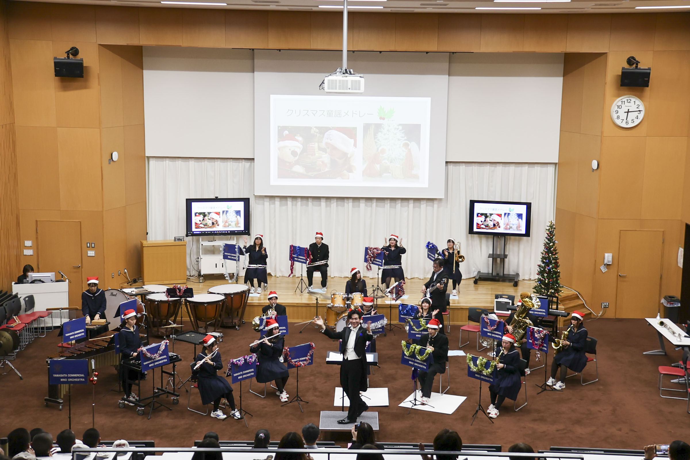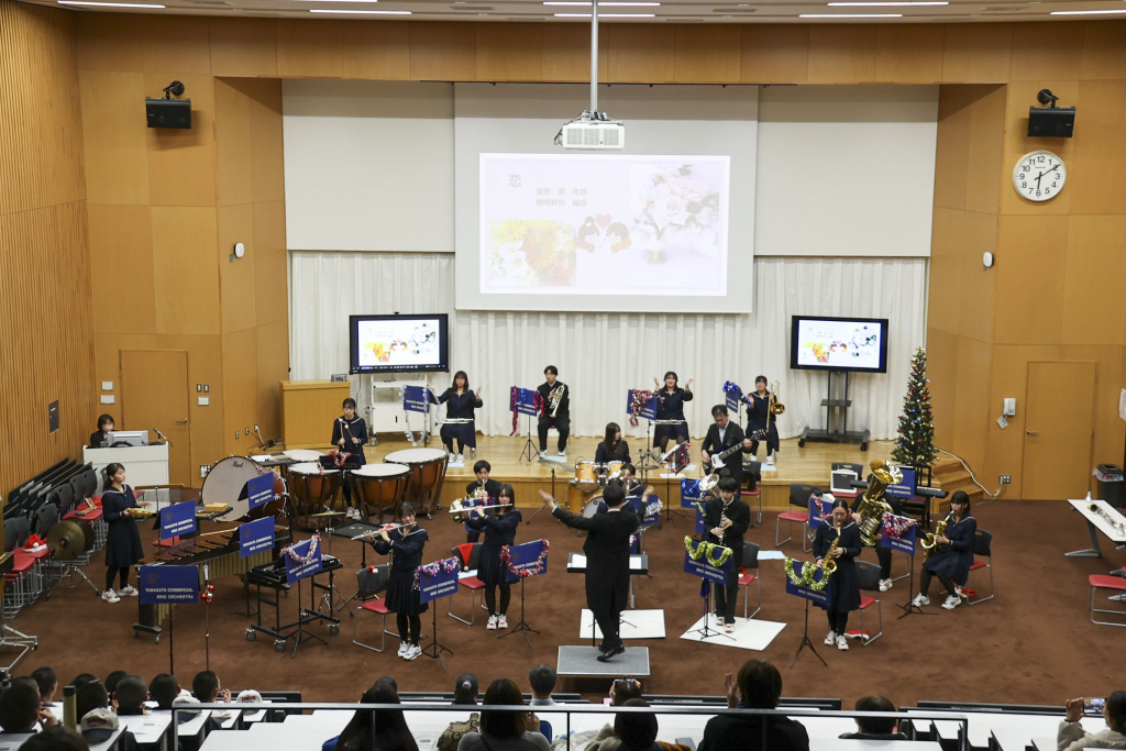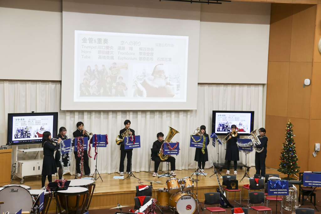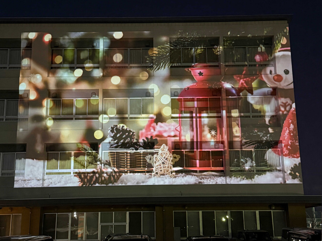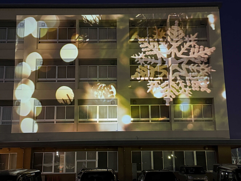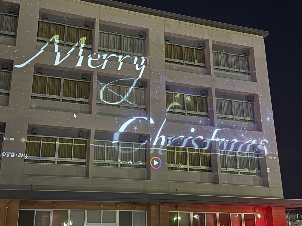 お知らせ 【クリスマス】プロジェクションマッピング・クリスマスコンサート 2025.12.18 12月18日夕方、本校校舎正面を会場に、産業調査部によるプロジェクションマッピングを実施しました。生徒が企画・制作した映像が校舎外壁に映し出され、幻想的な光と音の演出に、多くの来場者が足を止めて見入っていました。続いて、吹奏楽部によるクリスマスコンサートを開催し、季節感あふれる楽曲の演奏で会場は温かな雰囲気に包まれました。生徒の創造力と表現力が光る、冬のひとときとなりました。