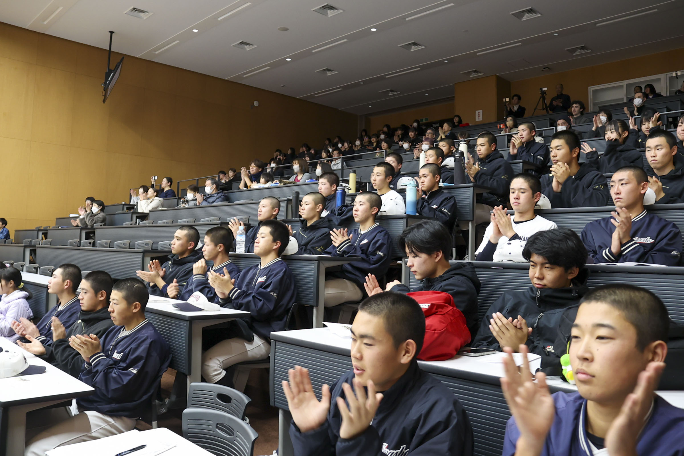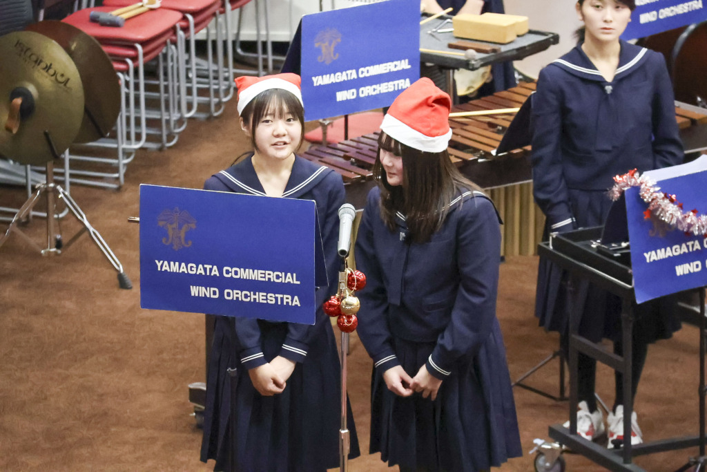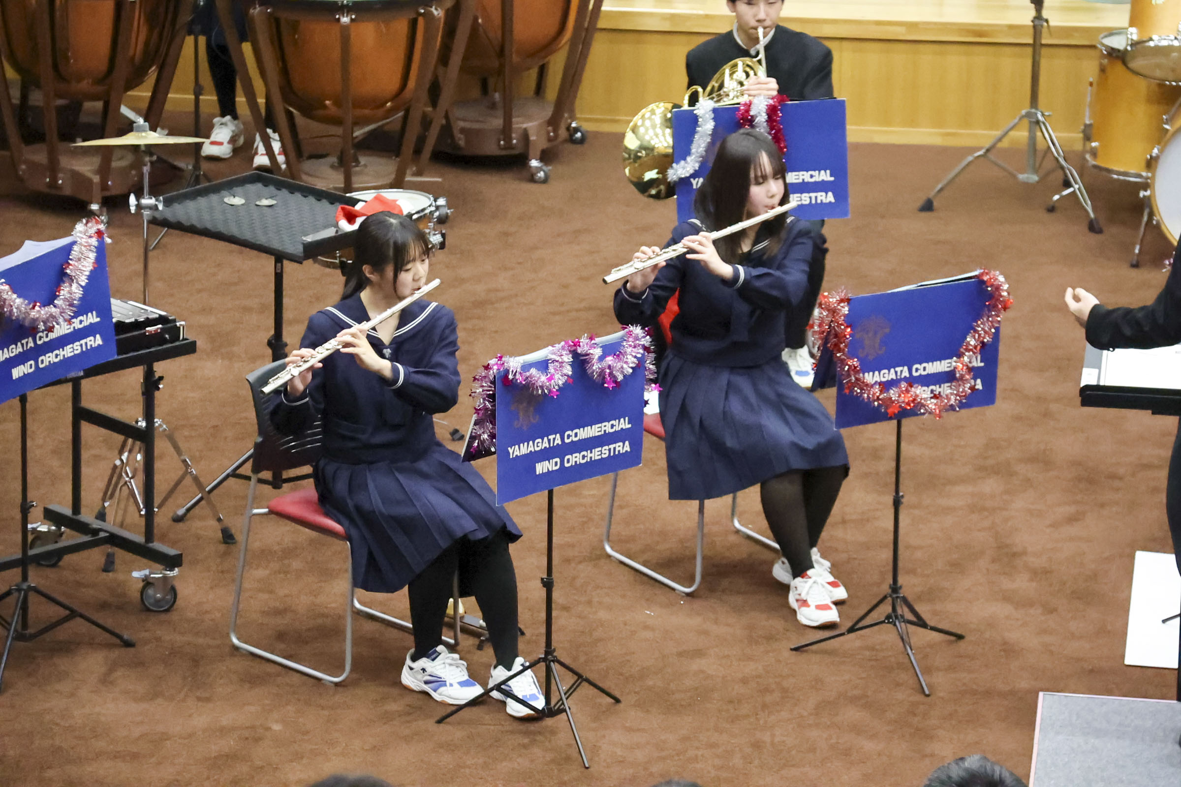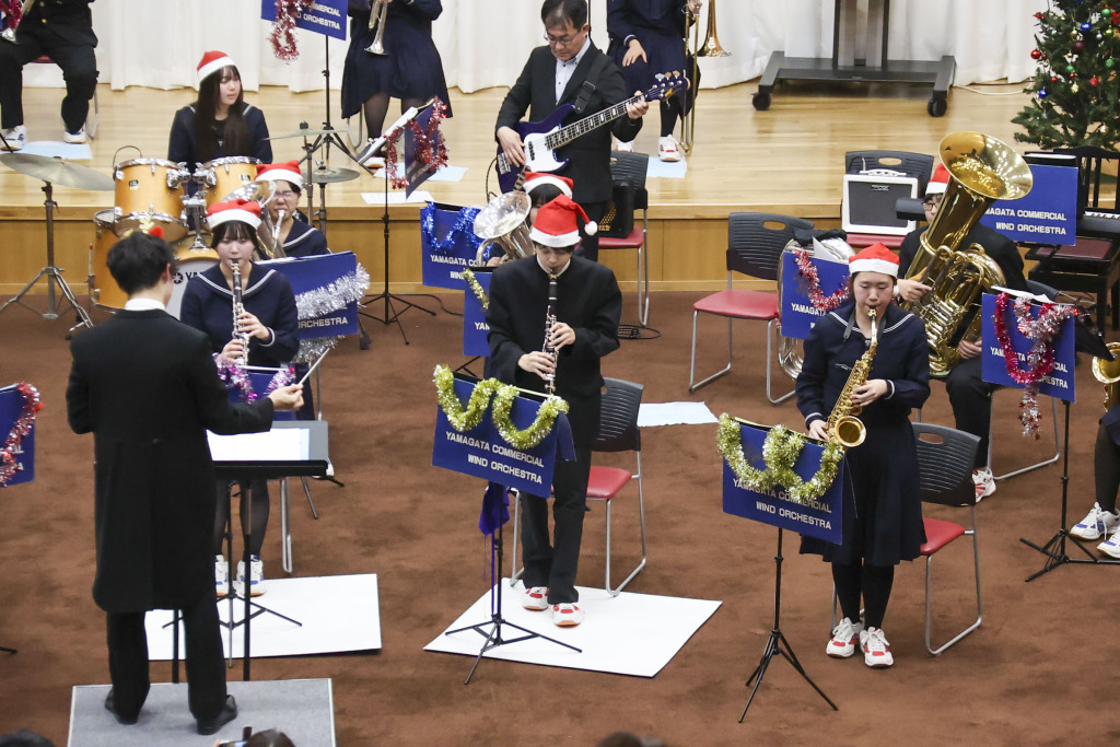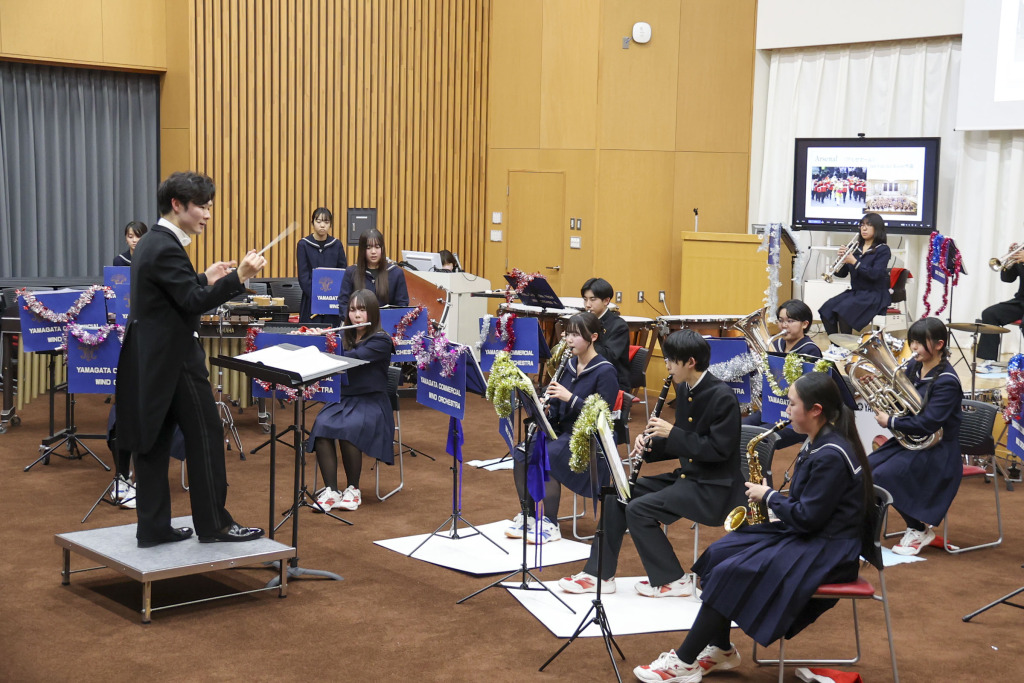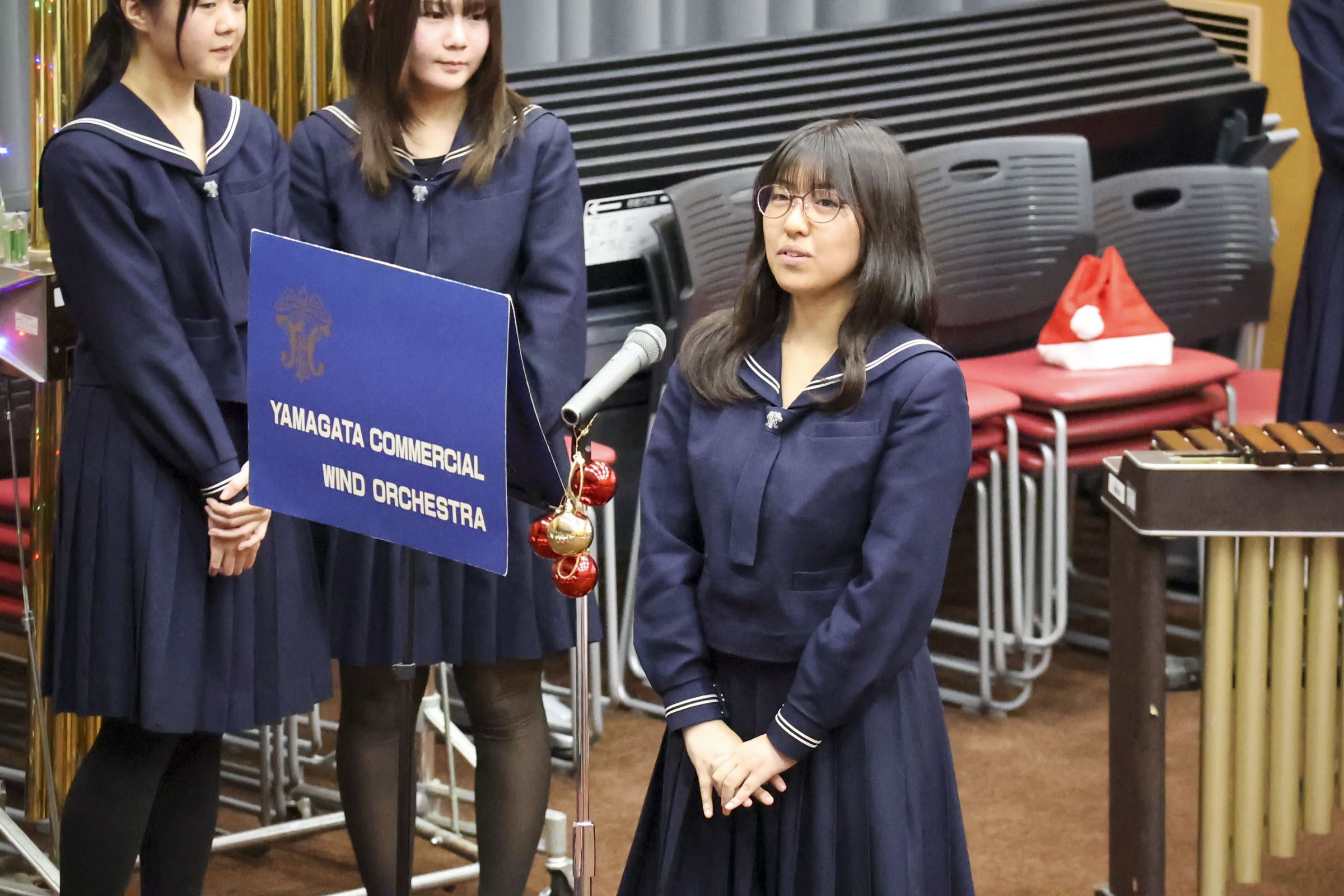 お知らせ 【クリスマス】プロジェクションマッピング・クリスマスコンサート 2025.12.18 12月18日夕方、本校校舎正面を会場に、産業調査部によるプロジェクションマッピングを実施しました。生徒が企画・制作した映像が校舎外壁に映し出され、幻想的な光と音の演出に、多くの来場者が足を止めて見入っていました。続いて、吹奏楽部によるクリスマスコンサートを開催し、季節感あふれる楽曲の演奏で会場は温かな雰囲気に包まれました。生徒の創造力と表現力が光る、冬のひとときとなりました。