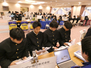 2月13日の午後、2年生の就職・公務員希望者46名が、山交ビル7階で開催された企業合同説明会に参加しました。県内外からさまざまな業種の企業24社が参加し、生徒たちは各企業のブースを回りながら、仕事内容ややりがい、企業の強みなどについて説明を受けました。多くの業種や企業を知る中で、自分に合った進路や企業を見つけていってほしいと思います。