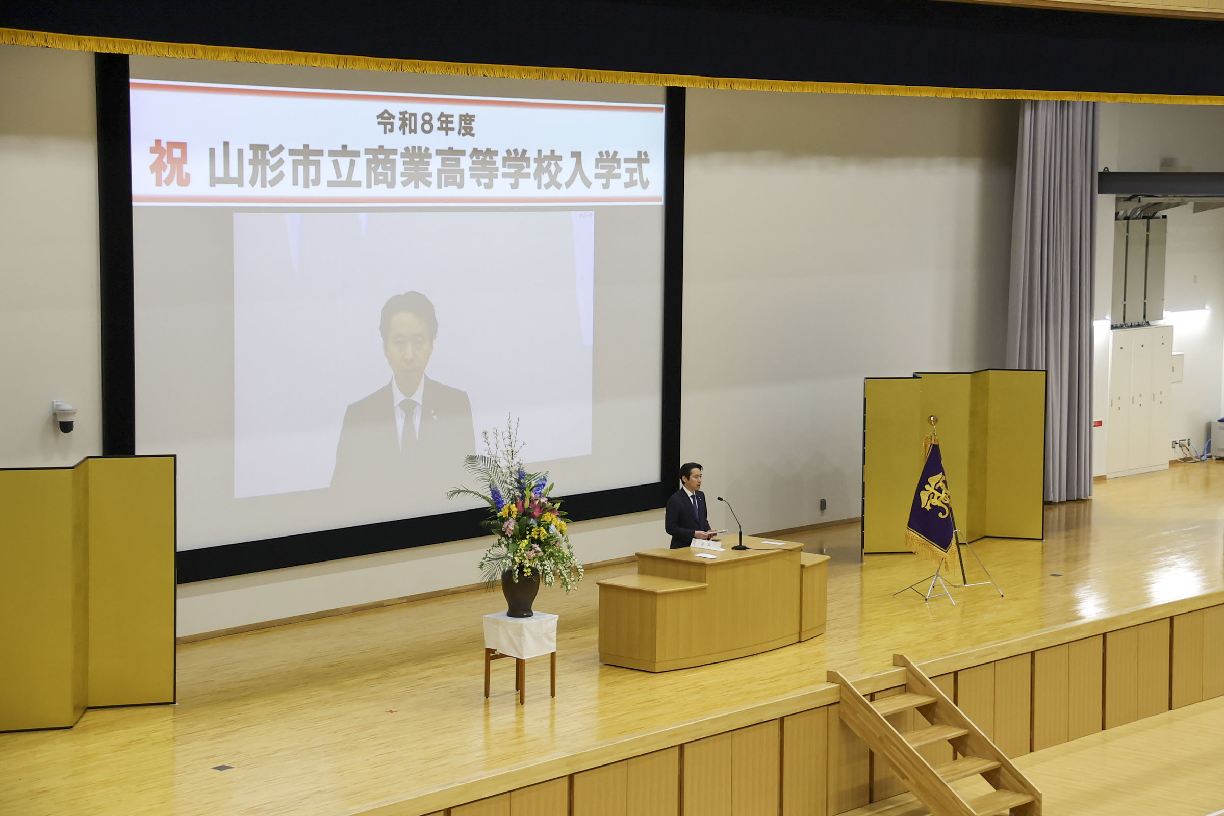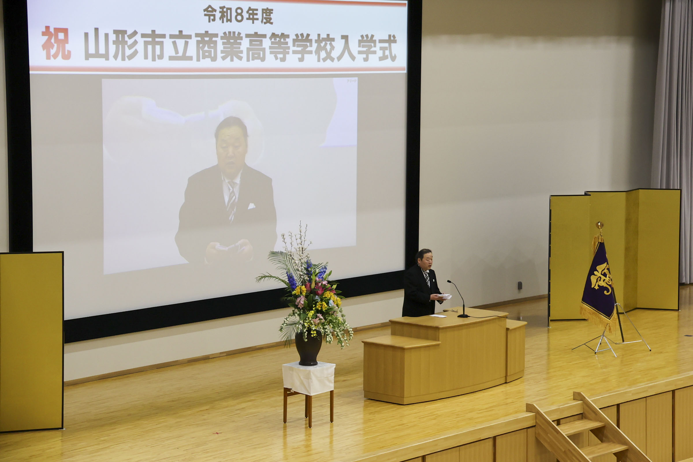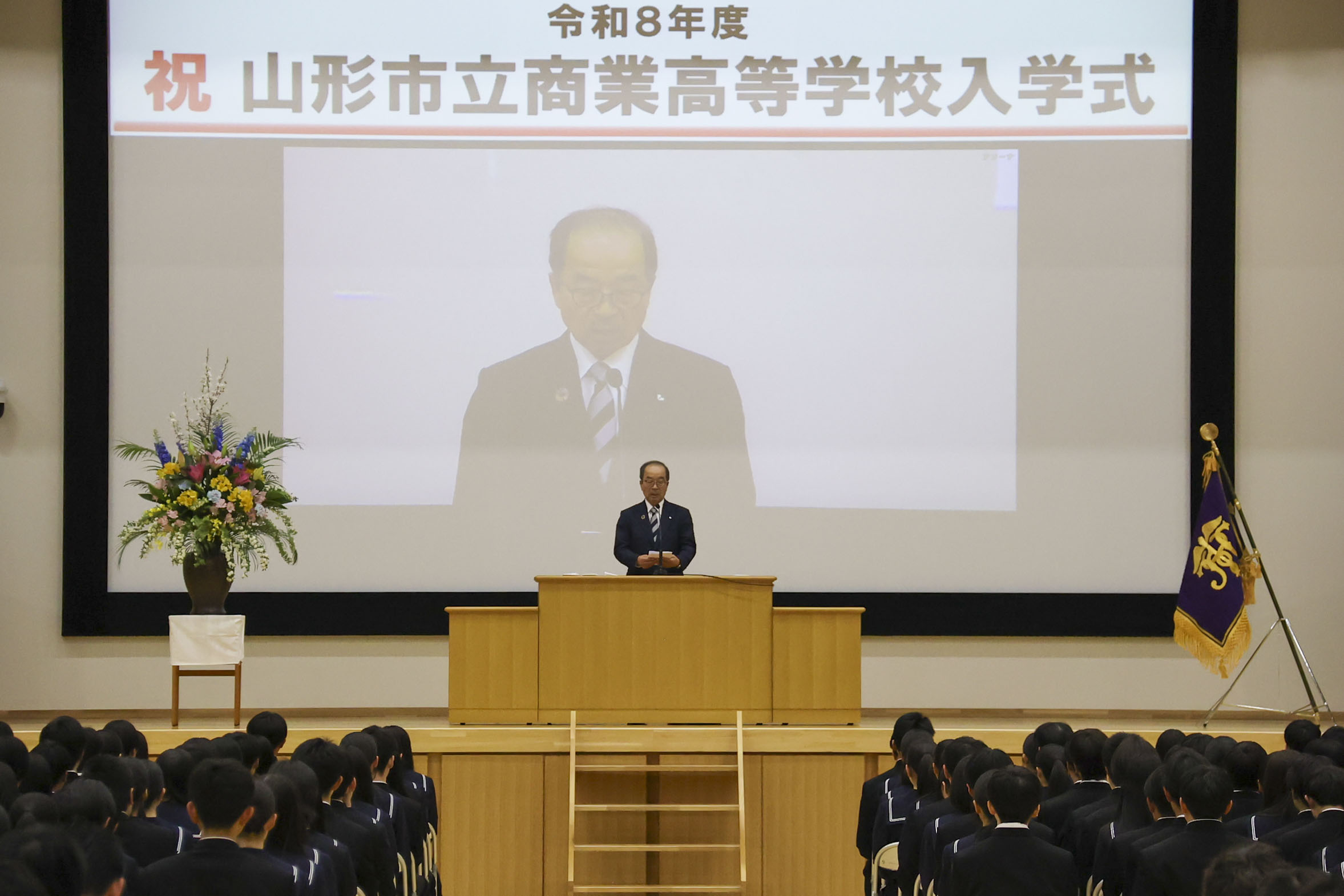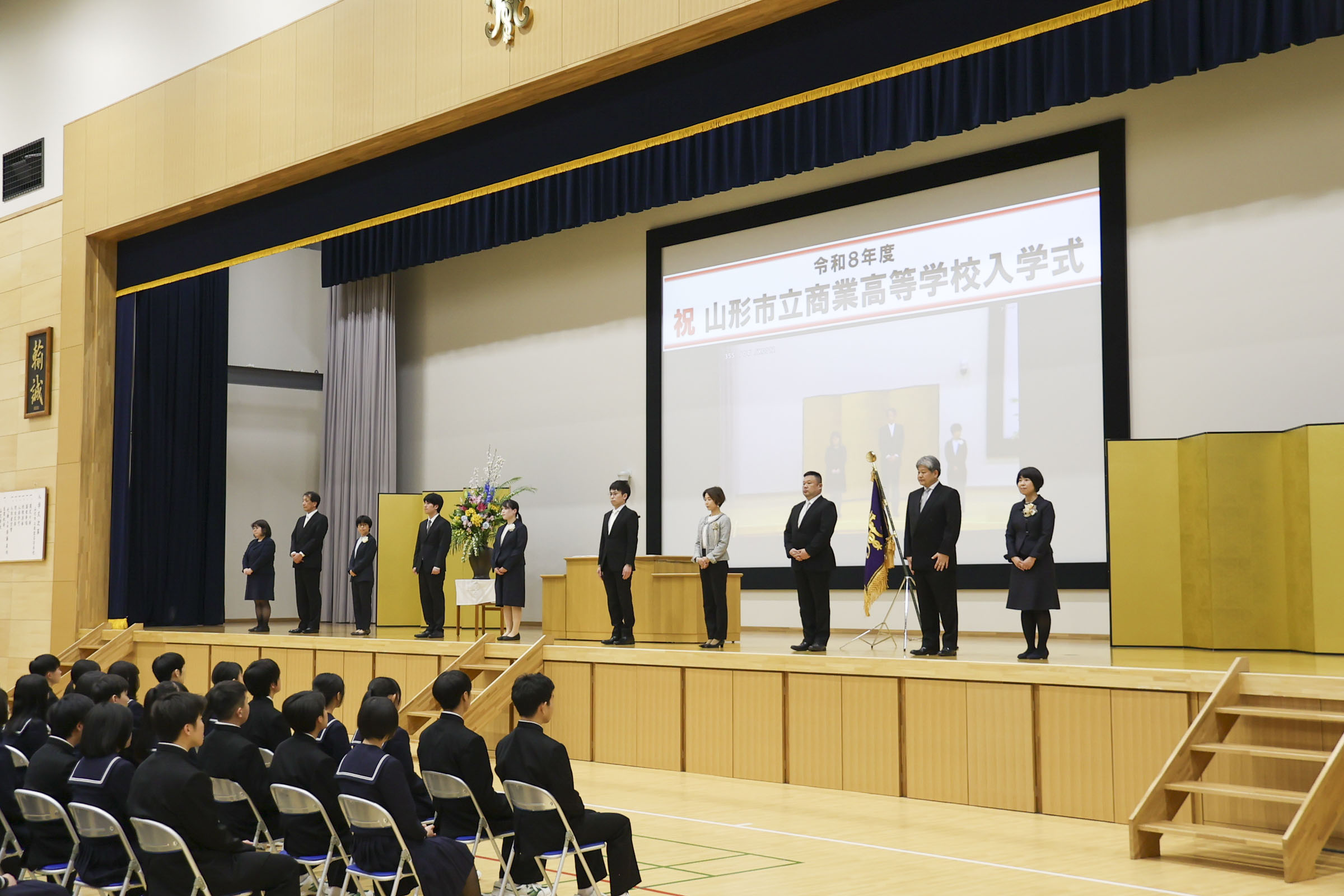 お知らせ 令和8年度入学式を挙行いたしました 2026.04.08 4月8日、桜が満開の中、令和8年度入学式が挙行されました。今年度は、総合ビジネス科160名、情報科41名、経済科80名、計281名が、伝統ある山形市立商業高等学校の一員として新たな一歩を踏み出しました。式典では、国歌斉唱、校歌演奏に続き、担任から一人ひとりの名前が読み上げられ、校長より入学が許可されました。新入生代表の齋藤さんによる宣誓では、「山商生であることに誇りと自信を持ち、学業に励み、心身を鍛える」という力強い決意が述べられました。また、山形市長様、同窓会長様をはじめとする多くの来賓の方々から温かい祝辞をいただきました。 猪又校長は式辞において、大正7年の創立から108年目を迎える本校の歴史に触れ、校訓である「輸誠(ゆせい)」を指針に、自分を偽らず真心を持って物事にあたることの大切さを説きました。高校生活は義務教育ではないからこそ、自らの行動に責任を持つ自立した姿勢が必要であり、他者と協調しながら自ら進むべき道を切り拓いてほしいと語りました。また、単なる知識の習得にとどまらず、「学び方を学ぶ」という生涯学習の基礎を身に付けること、そして切磋琢磨し合える生涯の友を見つけることを新入生に期待し、失敗を恐れず挑戦する姿を教職員一同で全力で支えると力強く述べました。 山形市長様からは、難関を突破した新入生への祝辞として、本校が東北2位・全国8位の検定実績を誇るトップクラスの商業高校であることや、多くの部活動が全国大会で活躍している伝統が紹介されました。校訓「輸誠」の精神を胸に高い志を立て、自分の人生を自分自身で決断し切り拓く力とたくましさを備えてほしいと激励しました。山形市としても、生徒たちが実り多い3年間を送り、山商の新たな歴史を築けるよう教育環境の充実を図り、その成長を支えていくことを約束しました。 同窓会会長様からは、3万5千人を超える卒業生を代表して、新入生を温かく迎え入れる言葉が贈られました。これからの3年間を社会へ羽ばたくための基礎をつくる重要な時期と位置づけ、将来の目標に向かって「自分をデザインする」意識を持ってほしいと語りかけました。勉強や部活動など様々な場面で、得意なことだけでなく新しいことにも積極的にチャレンジし、心・体・頭を動かす経験を積むことで、未来の自分を形づくるピースを積み重ねてほしいという願いを伝え、同窓会としても教育環境の整備や部活動への支援を通じて後輩たちを支えていく決意を示しました。
